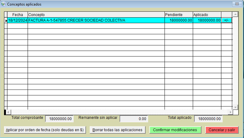 Seleccionas la factura a la cual aplicar el pago, por defecto se le aplica en orden cronológico a la factura mas antigua. En caso de ser correcta la aplicación que ofrece el sistema das en