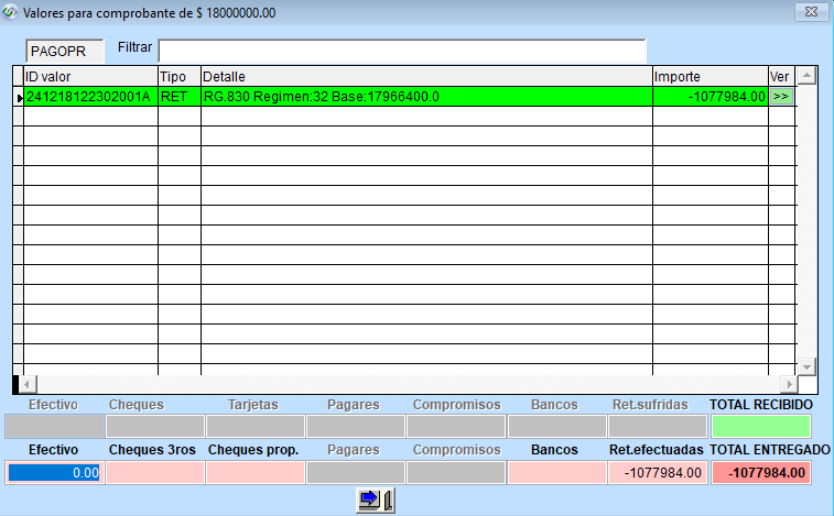 Podrá restarle ese monto aplicado en Ret. efectuadas al total del pago de forma manual para cargar el restante en el casillero que desee. Si desea hacerlo en el casillero de "efectivo", puede apretar la combinación de teclas